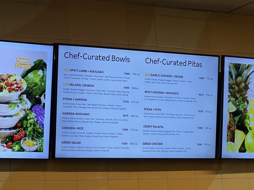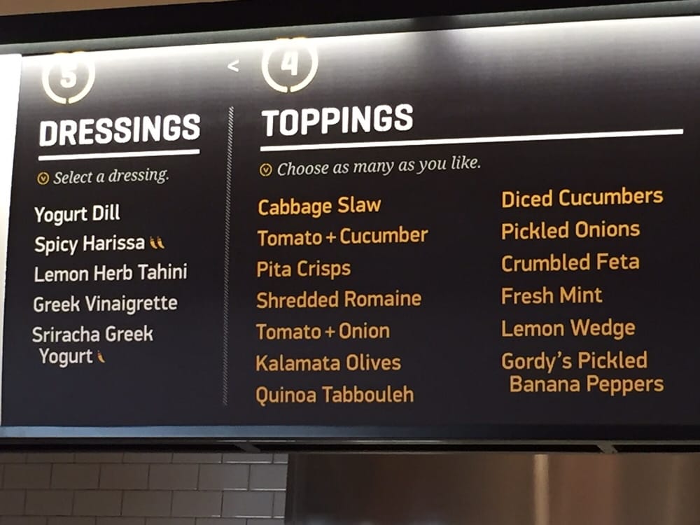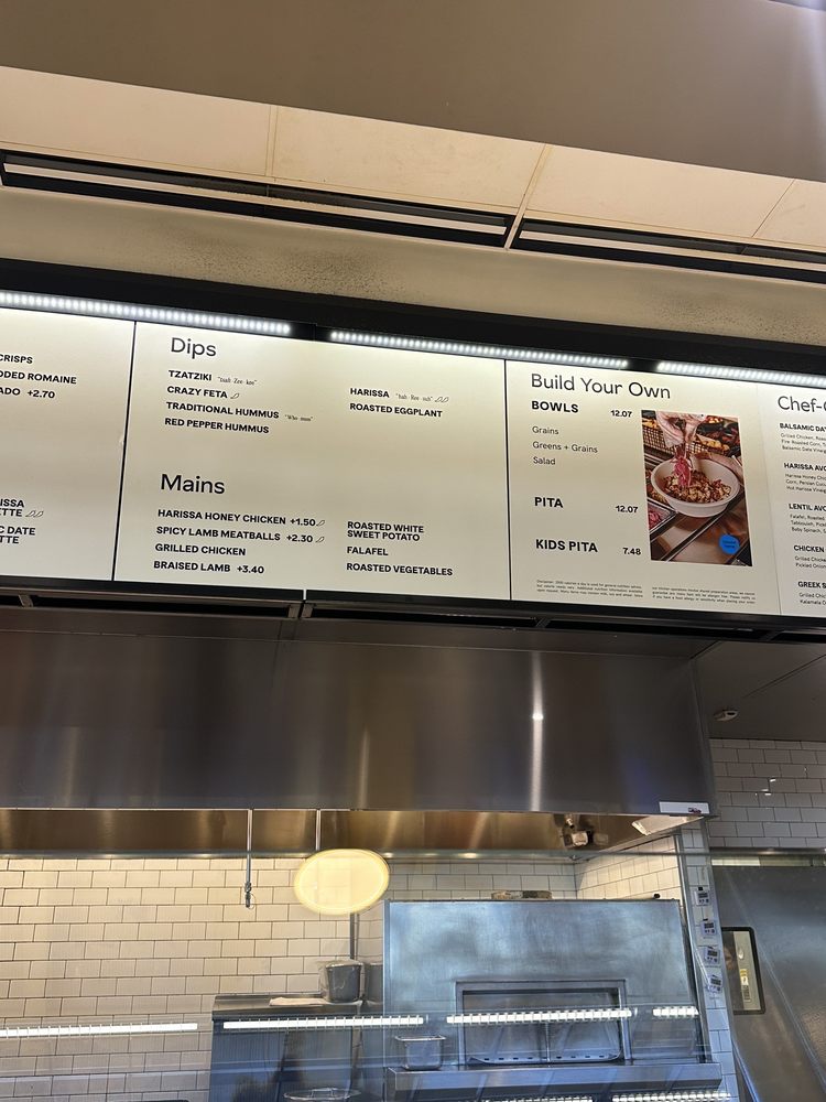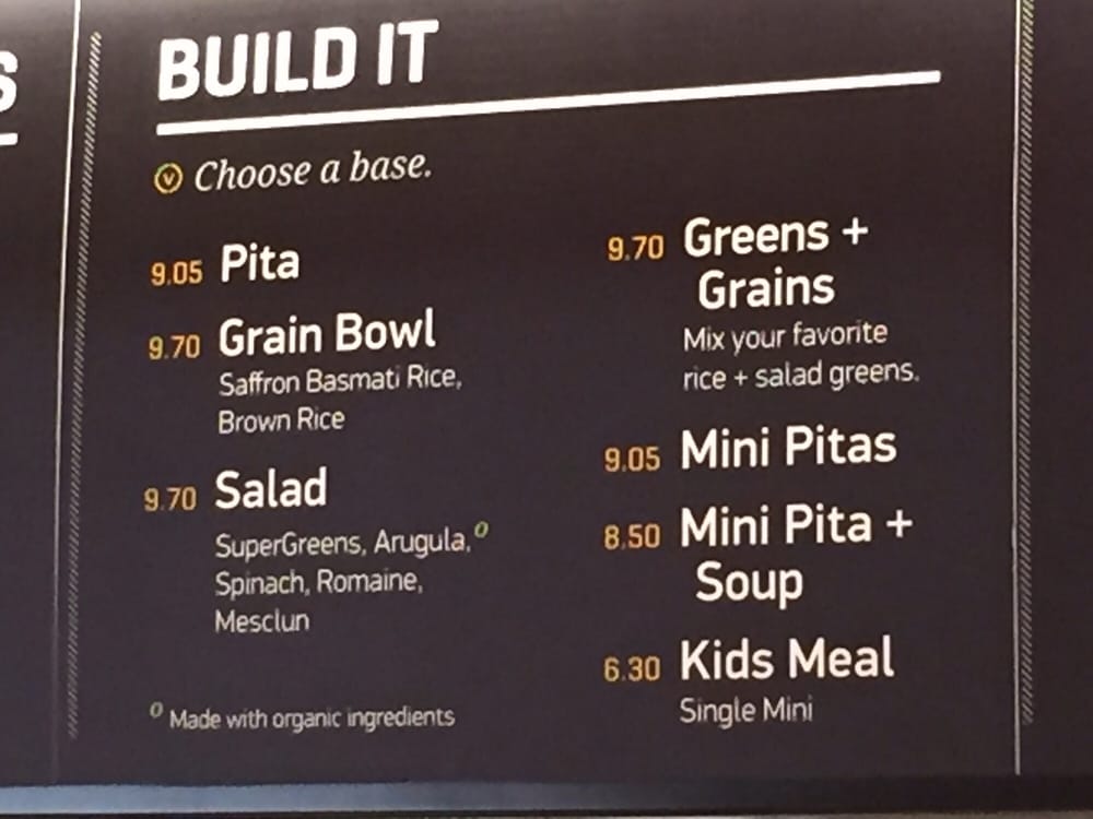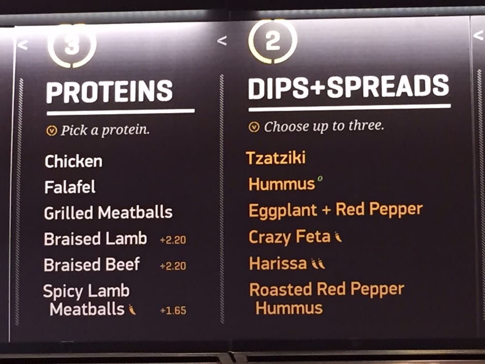 Base: Start with a pita, or choose a base for your bowl; greens, grains, or both. Dips: Pick up to three. Mains: Select one or mix two. Toppings: Add as many as you like. Dressings: Drizzle on top or on the side